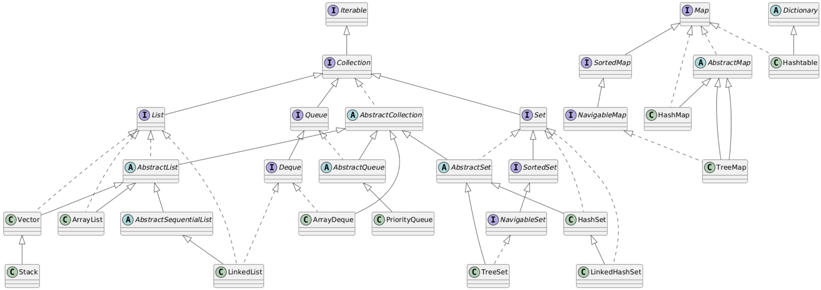 @startuml !theme vibrant interface Iterable interface Collection interface List interface Queue interface Set interface Map interface Deque interface SortedSet interface NavigableSet interface NavigableMap interface SortedMap abstract  AbstractList abstract  AbstractCollection abstract AbstractSequentialList abstract AbstractQueue abstract AbstractSet abstract AbstractMap abstract Dictionary class ArrayList class LinkedList class ArrayDeque class Vector class Stack class HashSet class LinkedHashSet class HashMap class Hashtable class TreeMap Iterable <|-- Collection Collection  <|-- List Collection  <|-- Queue Collection  <|-- Set Collection <|.. AbstractCollection AbstractCollection <|--  AbstractList AbstractCollection <|-- AbstractQueue AbstractCollection <|-- AbstractSet AbstractCollection <|-- ArrayDeque List  <|.. AbstractList List <|.. ArrayList List <|.. LinkedList List <|.. Vector Vector <|-- Stack AbstractList <|-- ArrayList AbstractList <|-- AbstractSequentialList AbstractList <|-- Vector AbstractSequentialList <|-- LinkedList AbstractQueue <|-- PriorityQueue Queue <|-- Deque Queue <|.. AbstractQueue Deque <|.. LinkedList Deque <|.. ArrayDeque Set <|.. AbstractSet Set <|.. HashSet Set <|.. LinkedHashSet Set <|-- SortedSet AbstractSet <|-- HashSet AbstractSet <|-- TreeSet SortedSet <|-- NavigableSet HashSet <|-- LinkedHashSet NavigableSet <|.. TreeSet Map <|.. AbstractMap Map <|.. HashMap Map <|.. Hashtable Map <|-- SortedMap AbstractMap <|-- HashMap AbstractMap <|-- TreeMap Dictionary  <|-- Hashtable SortedMap <|-- NavigableMap AbstractMap <|-- TreeMap NavigableMap <|.. TreeMap @enduml